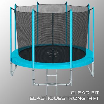 Батуты Clear Fit серии ElastiqueStrong — это современные батуты на усиленной раме из качественных комплектующих. Каркас батутов размеров 14 и 16 футов выполнен из усиленных труб диаметром 42 мм, кронштейны используются большей прочности, толщиной 2,05 мм, пружины длиной 165 мм. В комплект размера 14 футов входят батут с прыжковой поверхностью 3,8 м, защитная сеть на усиленных стойках полной длины (от верхней точки защитной сети до земли) и лестница, что делает батут безопасным, устойчивым, исключает падение и складывание каркаса. Качественные материалы и мощная рама предусматривают эксплуатацию батута 14ft пользователями до 200 кг. Дополнительно данная модель позволяет установить баскетбольный щит, комплект BasketStrong (щит, кольцо с сеткой, мяч, насос) можно приобрести отдельно.