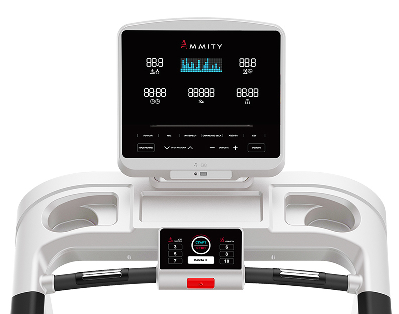 Консоль управления: функциональная, русифицированная панель, удобный экран состоит из 5 LED окон и LCD дисплея, помимо основных параметров: скорость, угол наклона, калории, время, дистанция – отображает количество шагов. Оптимизированный пакет программ включает целевые тренировки, тест BMI, пульсозависимые программы и 11 встроенных программ. Встроенная система мультимедия поддерживает формат MP3, консоль оборудована 2 динамиками. Также есть USB Charger, для подзарядки гаджетов во время занятий.