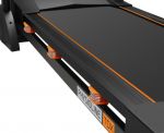 Тренировочный компьютер представлен голубым дисплеем диагональю 12 см. На экран одновременно выводятся все основные параметры тренировки – время, скорость, дистанция, потраченные калории, угол наклона и пульс. В программный пакет входят 9 предустановленных программ, направленных на тренировку скоростных качеств, выносливости, укрепления сердечно-сосудистой системы и похудания. Помимо предустановленных программ, можно воспользоваться самостоятельно регулируемым ручным управлением или создать собственную программу в одном из 3-х пользовательских режимов. Для считывания показаний пульса в поручни дорожки вмонтированы контактные сенсорные датчики. Благодаря так называемым "быстрым клавишам" управления можно отрегулировать скорость либо угол наклона, не снимая рук с поручней. Разнообразить тренировку поможет мультимедийная составляющая - в консоль дорожки установлены колонки мощностью 3 ватта, а носителями аудио файлов выступают MP3-плеер или смартфон. К другим особенностям дорожки относятся двухфазная гидравлическая система складывания soft-Drop™, которая существенно облегчает складывание дорожки, а при раскладывании обеспечивает медленное опускание полотна в последней фазе, гарантируя легкость и безопасность. Перемещение дорожки происходит за счет 2-х транспортировочных роликов. Выровнять положение тренажера относительно поверхности можно за счет компенсаторов неровностей пола.