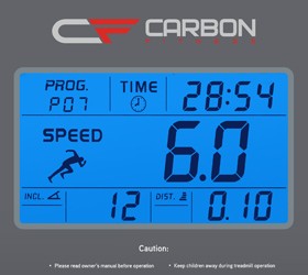 CARBON FITNESS T554 - один из самых оптимальных вариантов электрической беговой дорожки, сочетающий в себе низкую стоимость и характеристики, которые скорее можно отнести к разряду продвинутых. Сюда относятся надежный двигатель американской компании LEESON мощностью 1.75 л.с., рассчитанный на максимальный вес пользователя 120 кг., достаточное для комфортного бега полотно размером 120*40 см. и скоростью до 12 км./ч., а также регулируемый электрическим способом угол наклона от 0 до 12%. Амортизация удовлетворит большинство пользователей и состоит из 4-ех плоских эластомеров и 2-ух поролоновых подушек - по жесткости это скорее средний вариант, хотя наличие 2-ух поролоновых подушек смягчает активную центральную зону, значительно снижая нагрузку на стопы. Тренировочные показатели выводятся на многофункциональный голубой дисплей высокой контрастности размером 4.9 дюйма (12.5 см.). В программный пакет входят 12 предустановленных программ и самостоятельно регулируемый ручной режим. Сенсорные датчики пульса расположены на поручнях тренажера. Там же находятся и "быстрые кнопки" доступа к изменению угла наклона и скорости. За удобство складывания отвечает двухфазная гидравлическая система Easy Drop™ - она существенно облегчает складывание дорожки, а при раскладывании обеспечивает медленное опускание полотна в последней фазе, гарантируя легкость и безопасность. Перемещение тренажера происходит за счет 2-ух транспортировочных роликов. Характеристики: