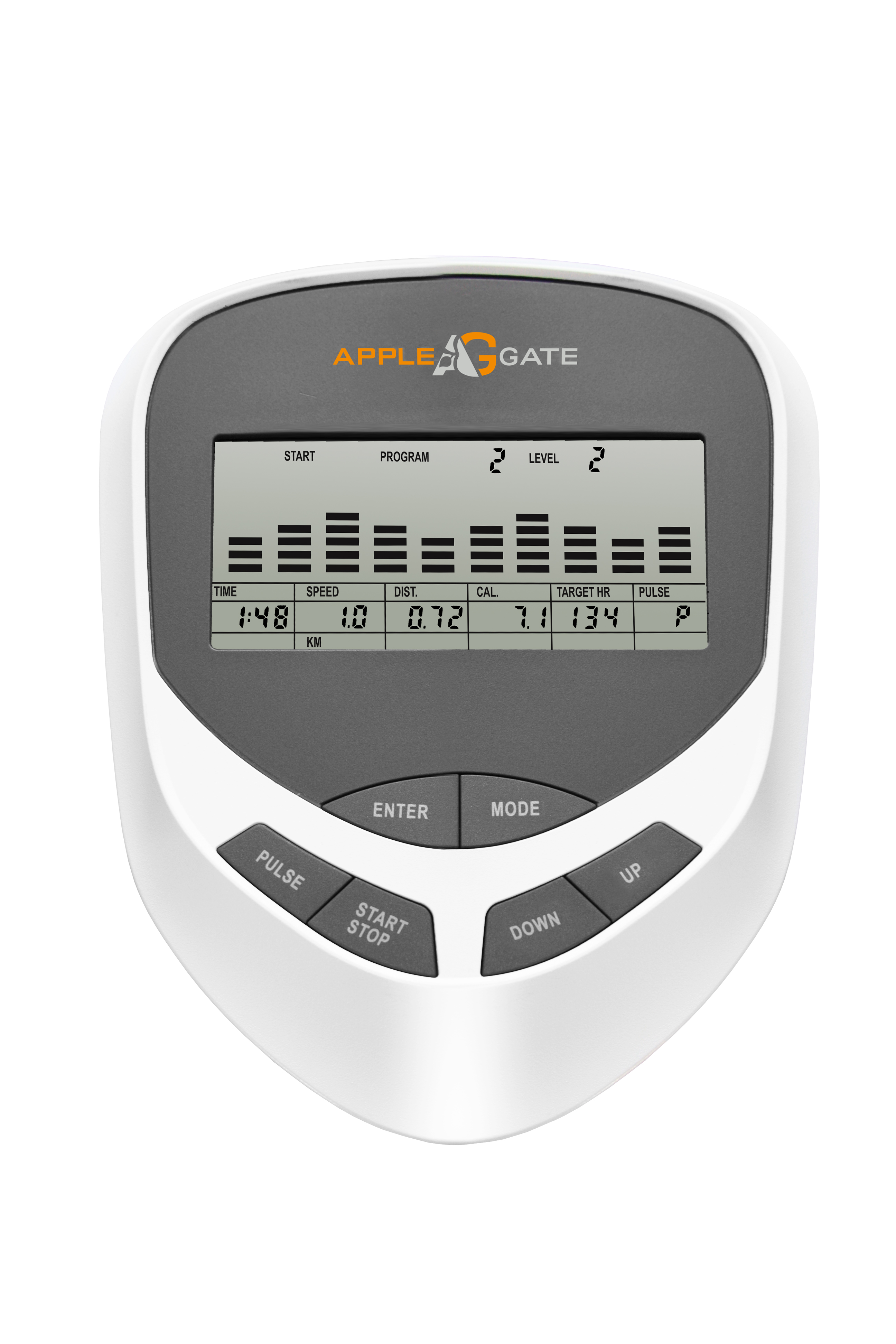 Тренировочный компьютер представлен многофункциональным черно-белым LCD-дисплеем диагональю 14,5 см с профилем тренировки. В программный пакет входят 8 предустановленных программ, направленных на тренировку скоростных качеств, выносливости, укрепления сердечно-сосудистой системы и похудания. Помимо этого, можно воспользоваться ручным режимом, а также создать собственную программу. Для тренировок с контролем пульса существуют 4 пульсозависимые программы с предустановленными значениями 60%, 75% и 85% от целевого максимального пульса. Эргонометрическая функция (ватты) позволяет зафиксировать необходимый уровень нагрузки – он останется постоянным вне зависимости от скорости вращения педалей.