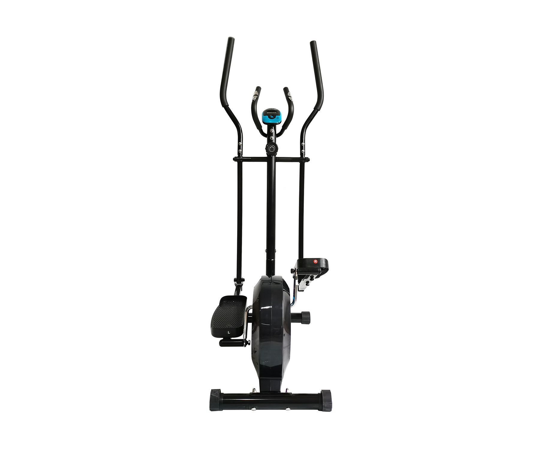Эллиптический тренажер для домашнего использования. Модель с высокоскоростным маховиком и магнитной системой нагружения. Механическая (ручная) регулировка изменения нагрузки с помощью рукоятки на стойке тренажера. 8 промежуточных положений. Консоль с LCD-экраном компьютера отображает все необходимые параметры тренировки: время, скорость, дистанция, калории, скан, пульс. Датчики пульса расположены на дополнительных рукоятках тренажера. Большие педали с нескользящим покрытием и бортиком по краям.