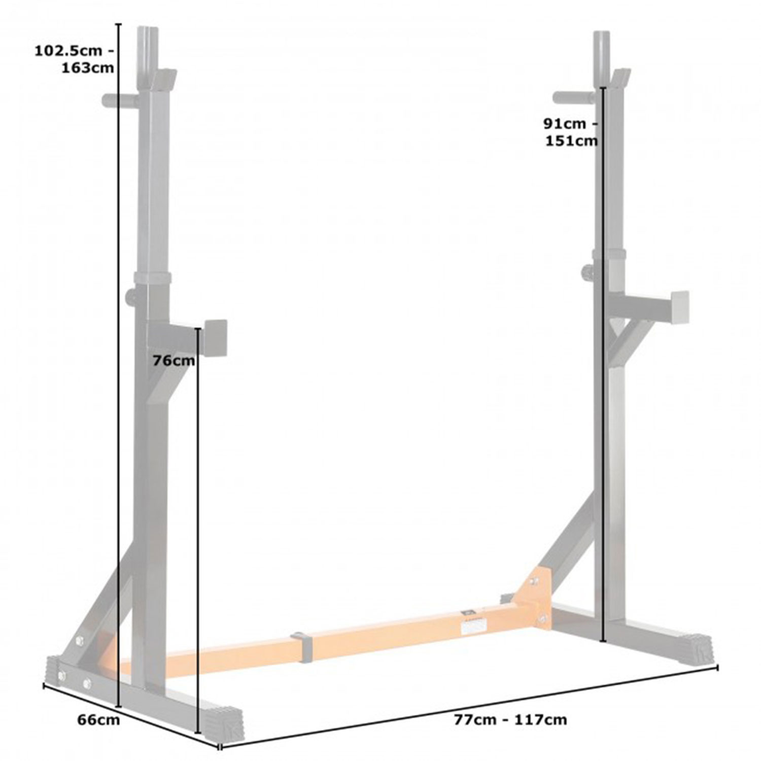 Стойки под штангу регулируются по ширине на расстоянии от 77 до 117 см друг от друга. 10 уровней с шагом 5 см.