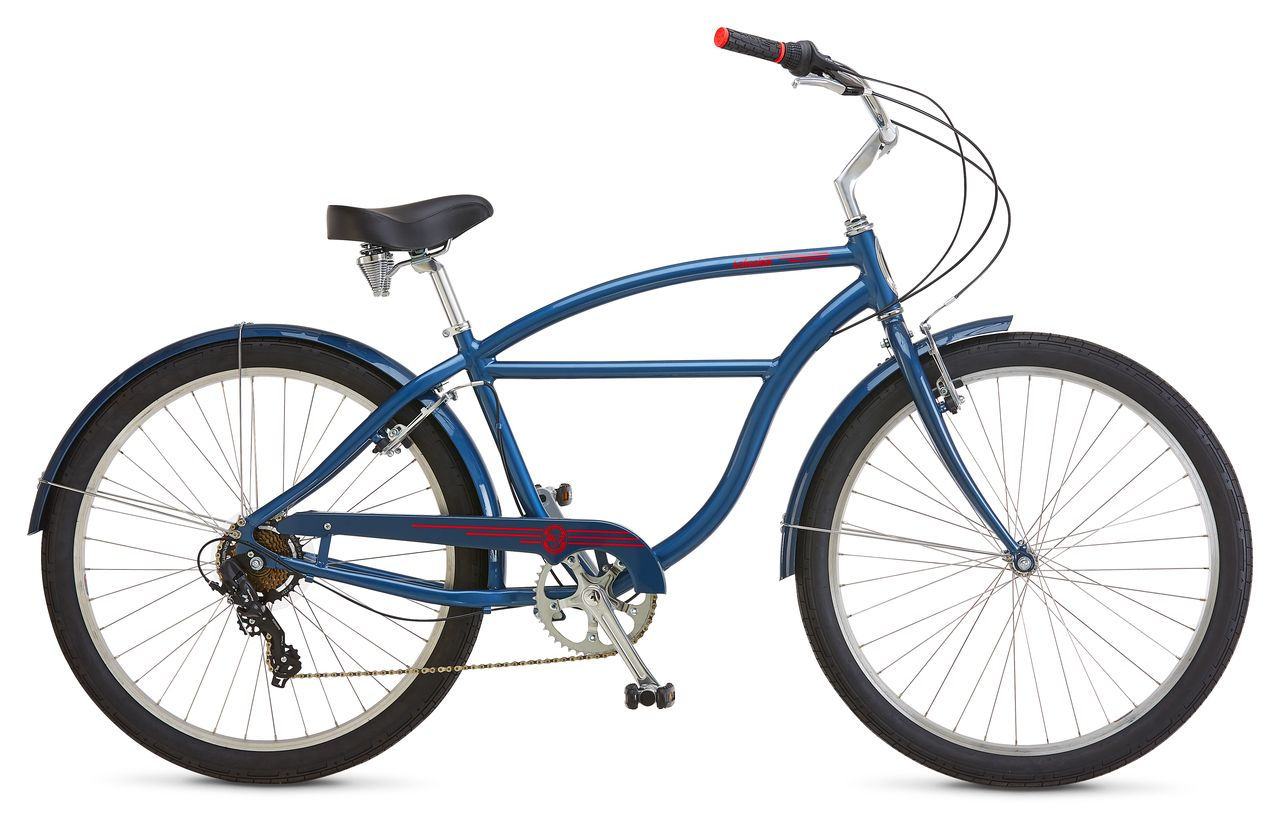 Alu 7 – это облегчённая модель семи скоростного круизёра, собранная на базе алюминиевой рамы. Этот велосипед сочетает в себе низкий вес, классический дизайн и надёжность современных комплектующих. Вынесенная вперёд каретка и заваленный назад угол подседельного штыря новой рамы Schwinn Relaxed Position создают максимально комфортную геометрию и придают управляемости при езде на велосипеде. Стабильности при движении этому круизёру так же добавляет увеличенный размер колёс: 27,5” – это самый современный стандарт. Широкое подпружиненное седло и руль регулируются по высоте и наклону – это помогает подобрать для Вас идеальную посадку. Семи скоростная трансмиссия Shimano Tourney управляется переключателями типа Грипшифт на руле, плавно и чётко меняет передачи и не требует частого обслуживания. Полноразмерные крылья и защита цепи предохраняют одежду от загрязнения и позволяют кататься в любую погоду. Входящая в комплект велосипеда подножка позволяет удобно парковать велосипед во время хранения или непродолжительной стоянки.