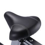 Вертикальный механический спин-байк с ременным типом привода и колодочной системой нагружения. Изменение нагрузки с помощью удобной рукоятки на корпусе тренажера. Анатомическое сидение регулируется в вертикальной и горизонтальной плоскости, и позволяют подобрать удобную посадку для тренировки. Для контроля пульса во время тренировки на руле есть встроенные датчики с отображением информации на дисплее компьютера. Питание компьютера от батареек (тип ААА, 2 шт). Для перемещения тренажера в помещении установлены колеса. Фиксация ног в педалях с помощью резиновых ремней с регулировкой.